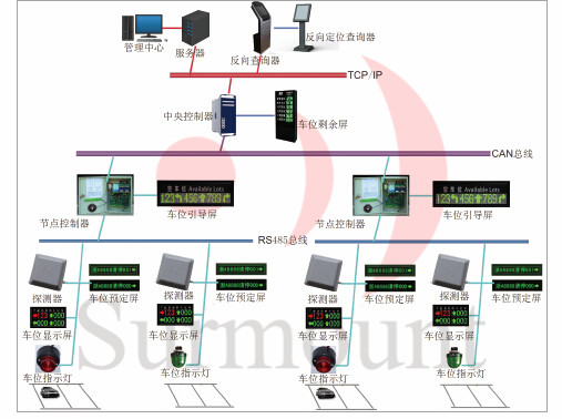 車(chē)輛智能引導(dǎo)系統(tǒng)根據(jù)停車(chē)位檢測(cè)系統(tǒng)提供的車(chē)位實(shí)時(shí)狀態(tài),為車(chē)位引導(dǎo)提供數(shù)據(jù),通過(guò)數(shù)據(jù)采集器和節(jié)點(diǎn)控制器將數(shù)據(jù)實(shí)時(shí)發(fā)送到主控器和管理電腦,由主控制器及時(shí)更新各個(gè)交叉路口引導(dǎo)屏的空車(chē)位數(shù),指引客戶(hù)停車(chē)。同時(shí)根據(jù)車(chē)位使用情況控制車(chē)位指示燈顯示不同的顏色,紅色為占用,綠色為空位,客戶(hù)在50米外即可看到,根據(jù)車(chē)位指示燈的顏色客戶(hù)可很快找到車(chē)位。